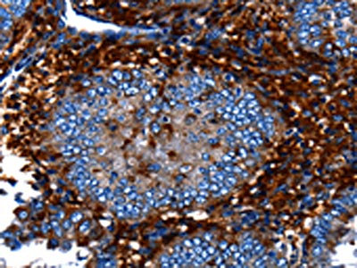 The image on the left is immunohistochemistry of paraffin-embedded Human cervical cancer tissue using CSB-PA102646(CNGA2 Antibody) at dilution 1/25, on the right is treated with fusion protein. (Original magnification: ×200)