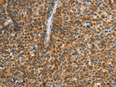 The image on the left is immunohistochemistry of paraffin-embedded Human liver cancer tissue using CSB-PA201854(COL1A2 Antibody) at dilution 1/20, on the right is treated with fusion protein. (Original magnification: ×200)