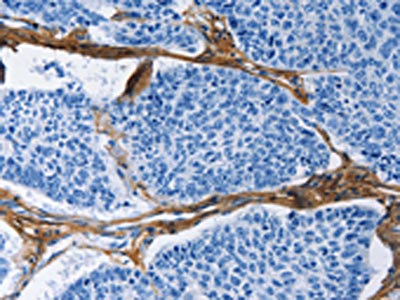 The image on the left is immunohistochemistry of paraffin-embedded Human lung cancer tissue using CSB-PA125350(COL3A1 Antibody) at dilution 1/60, on the right is treated with fusion protein. (Original magnification: ×200)