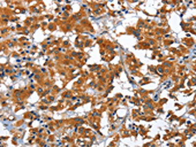 The image on the left is immunohistochemistry of paraffin-embedded Human gastric cancer tissue using CSB-PA749878(COPB1 Antibody) at dilution 1/30, on the right is treated with fusion protein. (Original magnification: ×200)