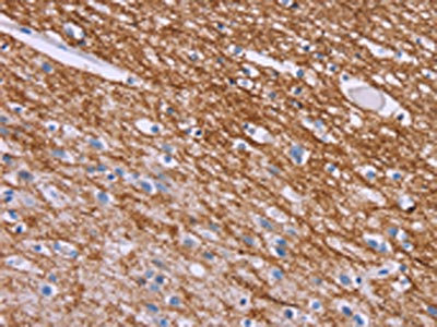 The image on the left is immunohistochemistry of paraffin-embedded Human brain tissue using CSB-PA033129(CRH Antibody) at dilution 1/20, on the right is treated with synthetic peptide. (Original magnification: ×200)