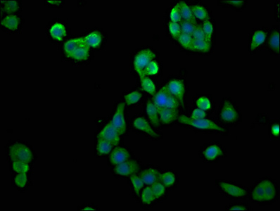 Immunofluorescence staining of PC-3 cells with CSB-PA526319HA01HU at 1:133, counter-stained with DAPI. The cells were fixed in 4% formaldehyde, permeabilized using 0.2% Triton X-100 and blocked in 10% normal Goat Serum. The cells were then incubated with the antibody overnight at 4°C. The secondary antibody was Alexa Fluor 488-congugated AffiniPure Goat Anti-Rabbit IgG(H+L).