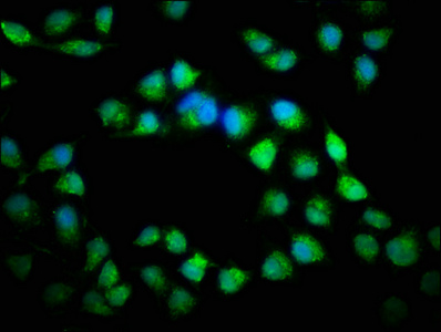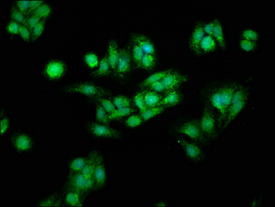Immunofluorescence staining of HepG2 cells with CSB-PA00174A0Rb at 1:166, counter-stained with DAPI. The cells were fixed in 4% formaldehyde, permeabilized using 0.2% Triton X-100 and blocked in 10% normal Goat Serum. The cells were then incubated with the antibody overnight at 4°C. The secondary antibody was Alexa Fluor 488-congugated AffiniPure Goat Anti-Rabbit IgG(H+L).