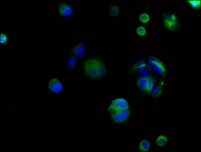 Immunofluorescence staining of Hela cells with CSB-PA00174A0Rb at 1:166, counter-stained with DAPI. The cells were fixed in 4% formaldehyde, permeabilized using 0.2% Triton X-100 and blocked in 10% normal Goat Serum. The cells were then incubated with the antibody overnight at 4°C. The secondary antibody was Alexa Fluor 488-congugated AffiniPure Goat Anti-Rabbit IgG(H+L).