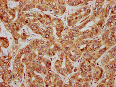 IHC image of CSB-PA00174A0Rb diluted at 1:500 and staining in paraffin-embedded human liver cancer performed on a Leica BondTM system. After dewaxing and hydration, antigen retrieval was mediated by high pressure in a citrate buffer (pH 6.0). Section was blocked with 10% normal goat serum 30min at RT. Then primary antibody (1% BSA) was incubated at 4°C overnight. The primary is detected by a biotinylated secondary antibody and visualized using an HRP conjugated SP system.