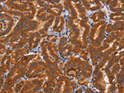 The image on the left is immunohistochemistry of paraffin-embedded Human thyroid cancer tissue using CSB-PA115010(CTSC Antibody) at dilution 1/50, on the right is treated with synthetic peptide. (Original magnification: ×200)
