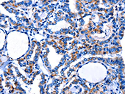 The image on the left is immunohistochemistry of paraffin-embedded Human thyroid cancer tissue using CSB-PA560952(CTSH Antibody) at dilution 1/5, on the right is treated with fusion protein. (Original magnification: ×200)