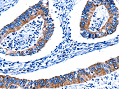 The image on the left is immunohistochemistry of paraffin-embedded Human colon cancer tissue using CSB-PA560952(CTSH Antibody) at dilution 1/5, on the right is treated with fusion protein. (Original magnification: ×200)