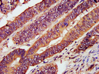 • IHC image of CSB-PA006253LA01HU diluted at 1:1200 and staining in paraffin-embedded human colon cancer performed on a Leica BondTM system. After dewaxing and hydration, antigen retrieval was mediated by high pressure in a citrate buffer (pH 6.0). Section was blocked with 10% normal goat serum 30min at RT. Then primary antibody (1% BSA) was incubated at 4°C overnight. The primary is detected by a biotinylated secondary antibody and visualized using an HRP conjugated SP system.