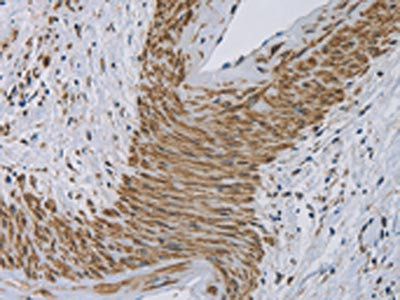 The image on the left is immunohistochemistry of paraffin-embedded Human cervical cancer tissue using CSB-PA870342(CYB5A Antibody) at dilution 1/30, on the right is treated with fusion protein. (Original magnification: ×200)