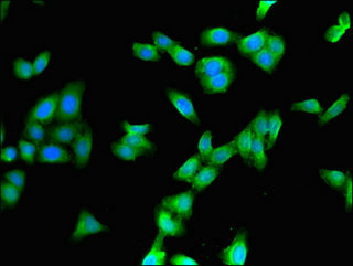 Immunofluorescent analysis of HepG2 cells using CSB-PA006439LA01HU at dilution of 1:100 and Alexa Fluor 488-congugated AffiniPure Goat Anti-Rabbit IgG(H+L)