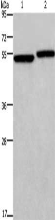 Gel: 8%SDS-PAGE, Lysate: 40 μg, Lane 1-2: Hela cells, 293T cells, Primary antibody: CSB-PA972361(DDX19B Antibody) at dilution 1/300, Secondary antibody: Goat anti rabbit IgG at 1/8000 dilution, Exposure time: 20 seconds