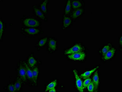 Immunofluorescent analysis of HepG2 cells using CSB-PA09854A0Rb at dilution of 1:100 and Alexa Fluor 488-congugated AffiniPure Goat Anti-Rabbit IgG(H+L)