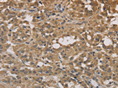 The image on the left is immunohistochemistry of paraffin-embedded Human liver cancer tissue using CSB-PA191736(DEGS1 Antibody) at dilution 1/30, on the right is treated with fusion protein. (Original magnification: ×200)