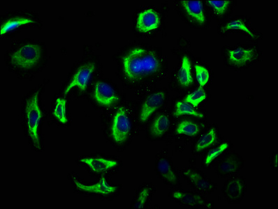 Immunofluorescence staining of A549 cells with CSB-PA006851LA01HU at 1:100, counter-stained with DAPI. The cells were fixed in 4% formaldehyde, permeabilized using 0.2% Triton X-100 and blocked in 10% normal Goat Serum. The cells were then incubated with the antibody overnight at 4°C. The secondary antibody was Alexa Fluor 488-congugated AffiniPure Goat Anti-Rabbit IgG(H+L).