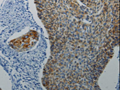 The image on the left is immunohistochemistry of paraffin-embedded Human cervical cancer tissue using CSB-PA695604(DRD4 Antibody) at dilution 1/5, on the right is treated with synthetic peptide. (Original magnification: ×200)