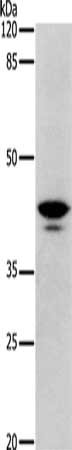 Gel: 10%SDS-PAGE, Lysate: 30 μg, Lane: Mouse skeletal muscle tissue, Primary antibody: CSB-PA695604(DRD4 Antibody) at dilution 1/350, Secondary antibody: Goat anti rabbit IgG at 1/8000 dilution, Exposure time: 1 minute