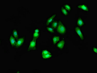 • Immunofluorescent analysis of HepG2 cells using CSB-PA007434LA01HU at dilution of 1:100 and Alexa Fluor 488-congugated AffiniPure Goat Anti-Rabbit IgG(H+L)
