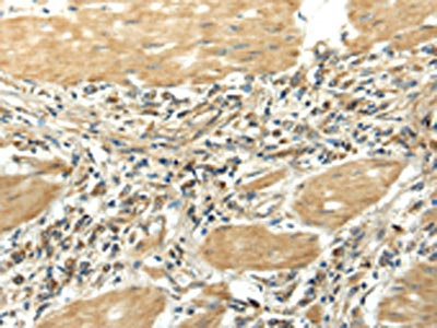 • The image on the left is immunohistochemistry of paraffin-embedded Human gastric cancer tissue using CSB-PA561188(EFNA3 Antibody) at dilution 1/25, on the right is treated with fusion protein. (Original magnification: ×200)