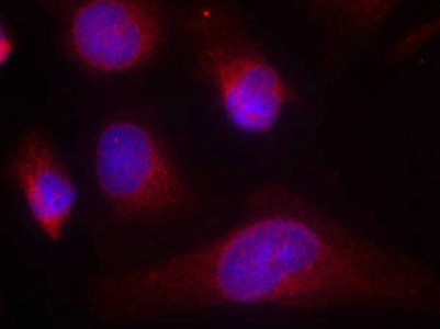 Immunofluorescence staining of methanol-fixed Hela cells using PKR(Ab-446) Antibody.