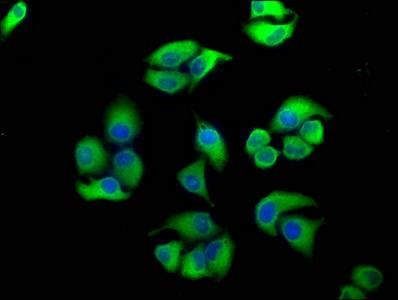 • Immunofluorescence staining of Hela cells with CSB-PA007512LA01HU at 1:100, counter-stained with DAPI. The cells were fixed in 4% formaldehyde, permeabilized using 0.2% Triton X-100 and blocked in 10% normal Goat Serum. The cells were then incubated with the antibody overnight at 4°C. The secondary antibody was Alexa Fluor 488-congugated AffiniPure Goat Anti-Rabbit IgG(H+L).