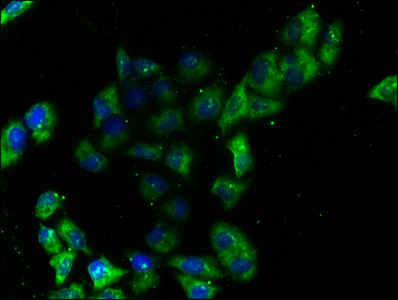 • Immunofluorescence staining of Hela cells with CSB-PA007667LA01HU at 1:100, counter-stained with DAPI. The cells were fixed in 4% formaldehyde, permeabilized using 0.2% Triton X-100 and blocked in 10% normal Goat Serum. The cells were then incubated with the antibody overnight at 4°C. The secondary antibody was Alexa Fluor 488-congugated AffiniPure Goat Anti-Rabbit IgG(H+L).