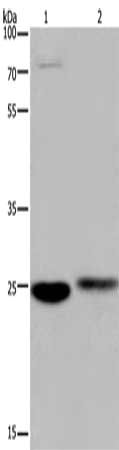 Gel: 8%SDS-PAGE, Lysate: 40 μg, Lane 1-2: Mouse brain tissue, human fetal muscle tissue, Primary antibody: CSB-PA283664(EPDR1 Antibody) at dilution 1/250, Secondary antibody: Goat anti rabbit IgG at 1/8000 dilution, Exposure time: 20 seconds