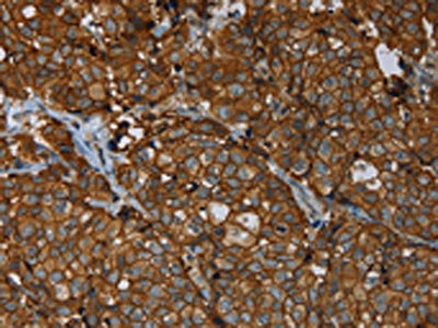 The image on the left is immunohistochemistry of paraffin-embedded Human liver cancer tissue using CSB-PA209003(ERBB4 Antibody) at dilution 1/40, on the right is treated with fusion protein. (Original magnification: ×200)