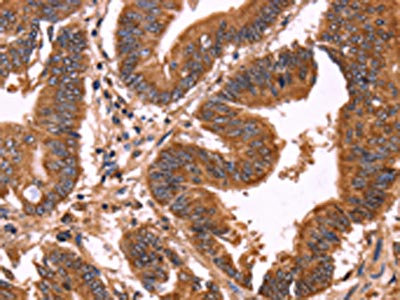 The image on the left is immunohistochemistry of paraffin-embedded Human colon cancer tissue using CSB-PA992687(ERP29 Antibody) at dilution 1/40, on the right is treated with synthetic peptide. (Original magnification: ×200)