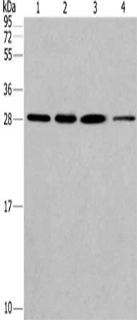 Gel: 10%SDS-PAGE, Lysate: 40 μg, Lane 1-4: Hela cells, human fetal liver tissue, A549 cells, 293T cells, Primary antibody: CSB-PA992687(ERP29 Antibody) at dilution 1/200, Secondary antibody: Goat anti rabbit IgG at 1/8000 dilution, Exposure time: 40 seconds
