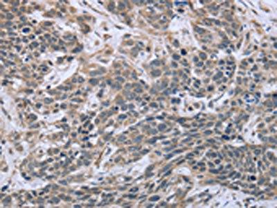 The image on the left is immunohistochemistry of paraffin-embedded Human cervical cancer tissue using CSB-PA135769(ESR2 Antibody) at dilution 1/30, on the right is treated with fusion protein. (Original magnification: ×200)
