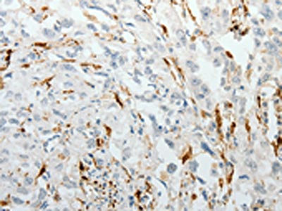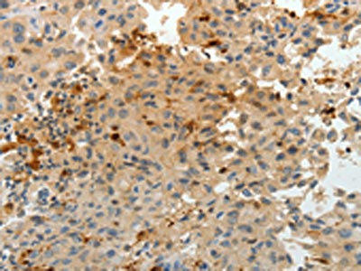 The image on the left is immunohistochemistry of paraffin-embedded Human lung cancer tissue using CSB-PA596700(F13A1 Antibody) at dilution 1/25, on the right is treated with fusion protein. (Original magnification: ×200)