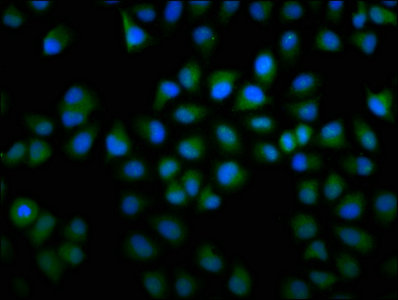 Immunofluorescence staining of Hela cells with CSB-PA007919LA01HU at 1:166, counter-stained with DAPI. The cells were fixed in 4% formaldehyde, permeabilized using 0.2% Triton X-100 and blocked in 10% normal Goat Serum. The cells were then incubated with the antibody overnight at 4°C. The secondary antibody was Alexa Fluor 488-congugated AffiniPure Goat Anti-Rabbit IgG(H+L).