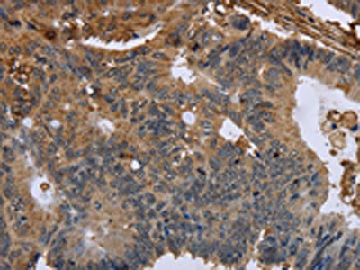 The image on the left is immunohistochemistry of paraffin-embedded Human colon cancer tissue using CSB-PA904028(FLNA Antibody) at dilution 1/50, on the right is treated with fusion protein. (Original magnification: ×200)