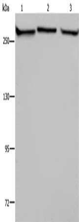 Gel: 6%SDS-PAGE, Lysate: 40 μg, Lane 1-3: PC3 cells, NIH/3T3 cells, HUVEB cells, Primary antibody: CSB-PA904028(FLNA Antibody) at dilution 1/1100, Secondary antibody: Goat anti rabbit IgG at 1/8000 dilution, Exposure time: 20 seconds