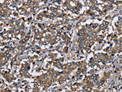 The image on the left is immunohistochemistry of paraffin-embedded Human liver cancer tissue using CSB-PA177666(FOXO1 Antibody) at dilution 1/20, on the right is treated with synthetic peptide. (Original magnification: ×200)