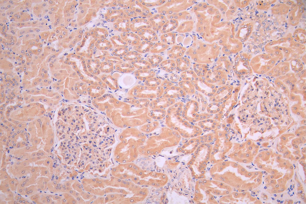 IHC image of CSB-PA816886LA01HU diluted at 1:50 and staining in paraffin-embedded human kidney tissue performed on a Leica BondTM system. After dewaxing and hydration, antigen retrieval was mediated by high pressure in a citrate buffer (pH 6.0). Section was blocked with 10% normal goat serum 30min at RT. Then primary antibody (1% BSA) was incubated at 4°C overnight. The primary is detected by a Goat anti-rabbit polymer IgG labeled by HRP and visualized using 0.05% DAB.