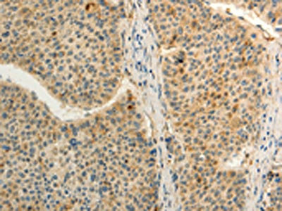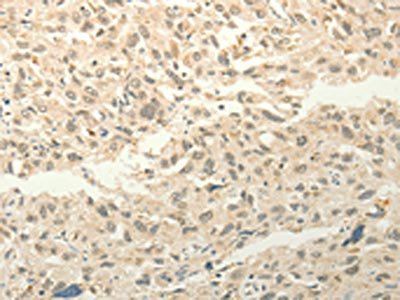 The image on the left is immunohistochemistry of paraffin-embedded Human liver cancer tissue using CSB-PA360153(FZD8 Antibody) at dilution 1/50, on the right is treated with synthetic peptide. (Original magnification: ×200)