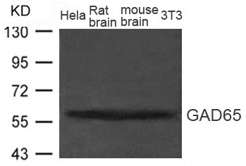 • Western blot analysis of extract from Rat brain, Mouse brain tissue and Hela, 3T3 cells using GAD65(GAD2)) Antibody