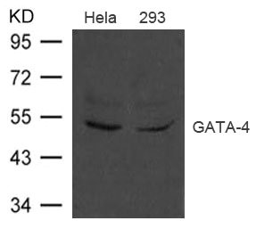 • Western blot analysis of extract from Hela and 293 cells using GATA-4 Antibody