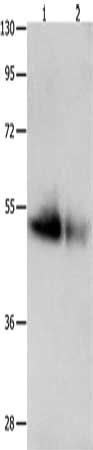 Gel: 8%SDS-PAGE, Lysate: 40 μg, Lane 1-2: Human fetal liver tissue, Human bladder carcinoma tissue, Primary antibody: CSB-PA294342(GDF6 Antibody) at dilution 1/500, Secondary antibody: Goat anti rabbit IgG at 1/8000 dilution, Exposure time: 10 minutes