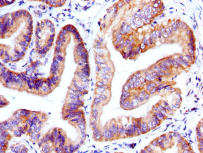 IHC image of CSB-PA009352EA01HU diluted at 1:400 and staining in paraffin-embedded human endometrial cancer performed on a Leica BondTM system. After dewaxing and hydration, antigen retrieval was mediated by high pressure in a citrate buffer (pH 6.0). Section was blocked with 10% normal goat serum 30min at RT. Then primary antibody (1% BSA) was incubated at 4°C overnight. The primary is detected by a biotinylated secondary antibody and visualized using an HRP conjugated SP system.