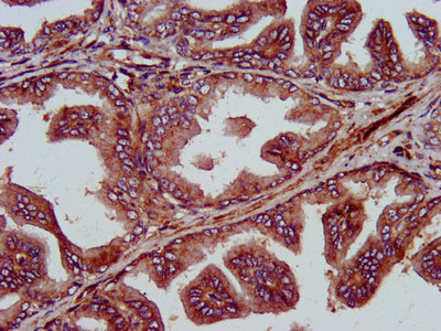 IHC image of CSB-PA617926LA01HU diluted at 1:400 and staining in paraffin-embedded human prostate tissue performed on a Leica BondTM system. After dewaxing and hydration, antigen retrieval was mediated by high pressure in a citrate buffer (pH 6.0). Section was blocked with 10% normal goat serum 30min at RT. Then primary antibody (1% BSA) was incubated at 4°C overnight. The primary is detected by a biotinylated secondary antibody and visualized using an HRP conjugated SP system.