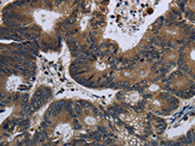 The image on the left is immunohistochemistry of paraffin-embedded Human colon cancer tissue using CSB-PA209664(GK Antibody) at dilution 1/60, on the right is treated with fusion protein. (Original magnification: ×200)