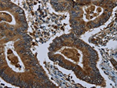 The image on the left is immunohistochemistry of paraffin-embedded Human colon cancer tissue using CSB-PA676168(GLUL Antibody) at dilution 1/60, on the right is treated with fusion protein. (Original magnification: ×200)