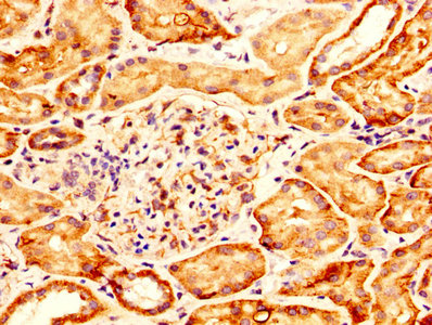 • IHC image of CSB-PA009708LA01HU diluted at 1:300 and staining in paraffin-embedded human kidney tissue performed on a Leica BondTM system. After dewaxing and hydration, antigen retrieval was mediated by high pressure in a citrate buffer (pH 6.0). Section was blocked with 10% normal goat serum 30min at RT. Then primary antibody (1% BSA) was incubated at 4°C overnight. The primary is detected by a biotinylated secondary antibody and visualized using an HRP conjugated SP system.