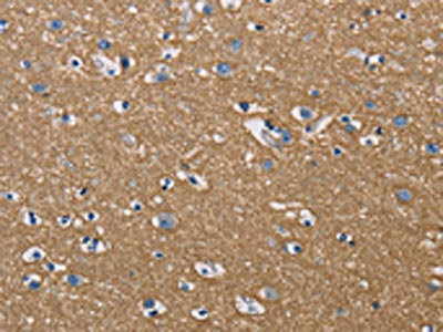 • The image on the left is immunohistochemistry of paraffin-embedded Human brain tissue using CSB-PA223691(GPM6A Antibody) at dilution 1/50, on the right is treated with fusion protein. (Original magnification: ×200)