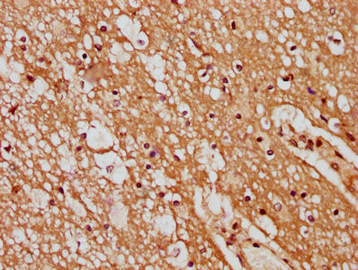 IHC image of CSB-PA736202LA01HU diluted at 1:400 and staining in paraffin-embedded human brain tissue performed on a Leica BondTM system. After dewaxing and hydration, antigen retrieval was mediated by high pressure in a citrate buffer (pH 6.0). Section was blocked with 10% normal goat serum 30min at RT. Then primary antibody (1% BSA) was incubated at 4°C overnight. The primary is detected by a biotinylated secondary antibody and visualized using an HRP conjugated SP system.