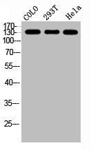 • Western Blot analysis of COLO 293T HELA cells using GPR158 Polyclonal Antibody