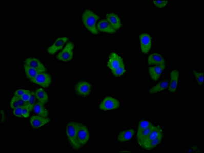 Immunofluorescence staining of HepG2 cells with CSB-PA009812LA01HU at 1:266, counter-stained with DAPI. The cells were fixed in 4% formaldehyde, permeabilized using 0.2% Triton X-100 and blocked in 10% normal Goat Serum. The cells were then incubated with the antibody overnight at 4°C. The secondary antibody was Alexa Fluor 488-congugated AffiniPure Goat Anti-Rabbit IgG(H+L).